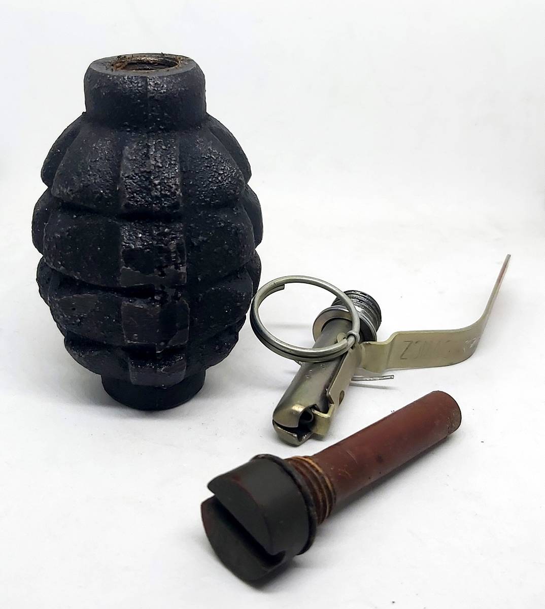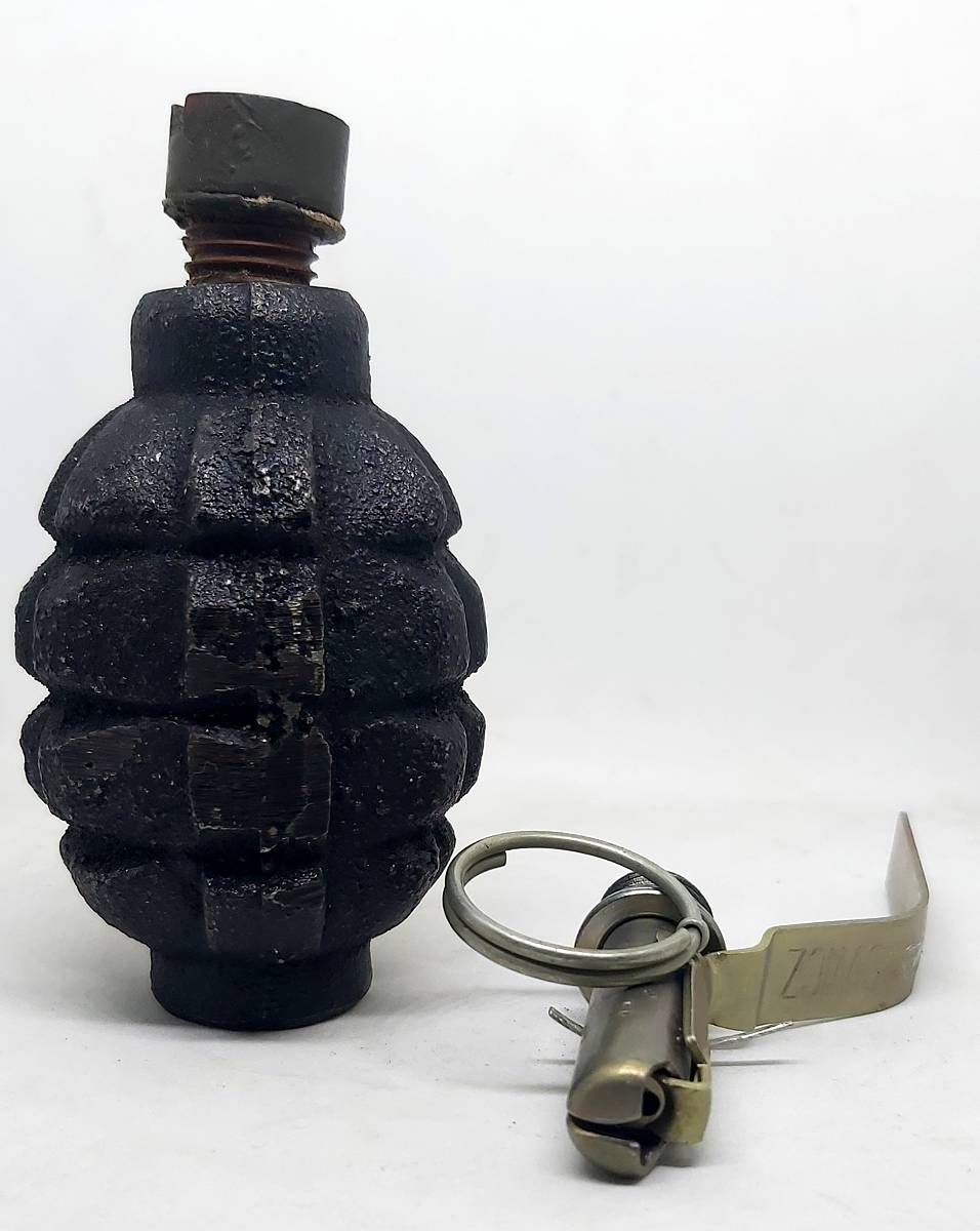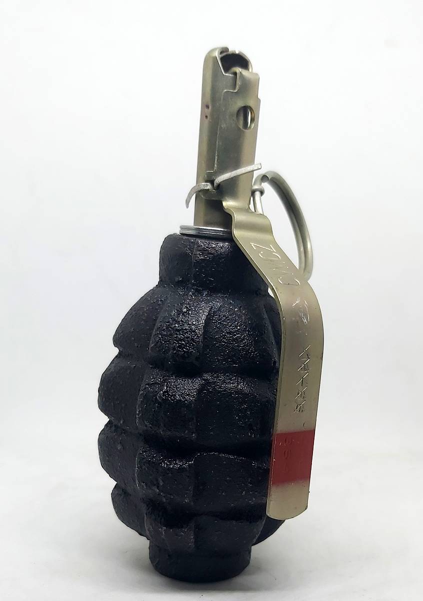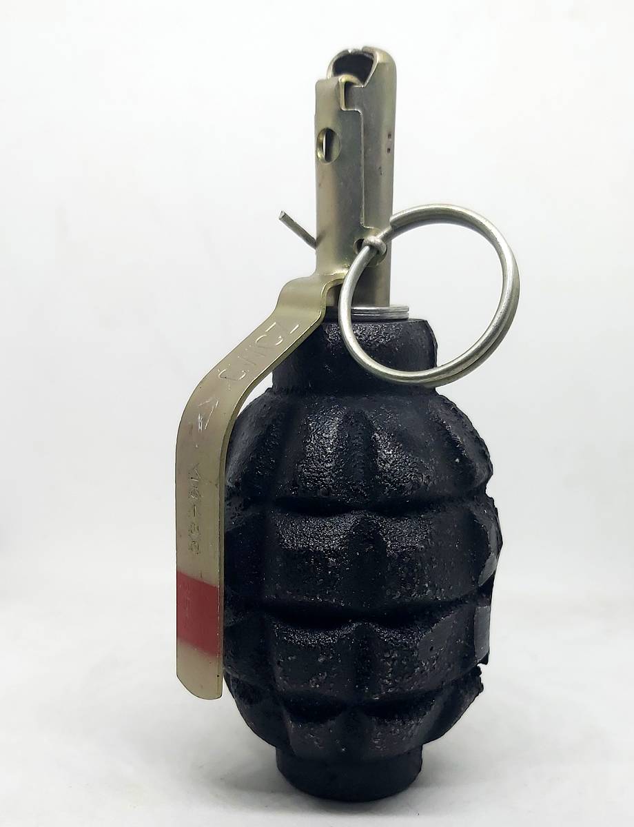 Ciężki, żeliwny odlew granatu obronnego F1. Malowanie w kolorze czarnym. Łyżka zapalnika może posiadać czerwony pasek oznaczający zapalnik w wersji ćwiczebnej. Doskonały przedmiot kolekcjonerski oraz do wykorzystania w rekonstrukcjach historycznych oraz do zajęć w szkołach wojskowych.