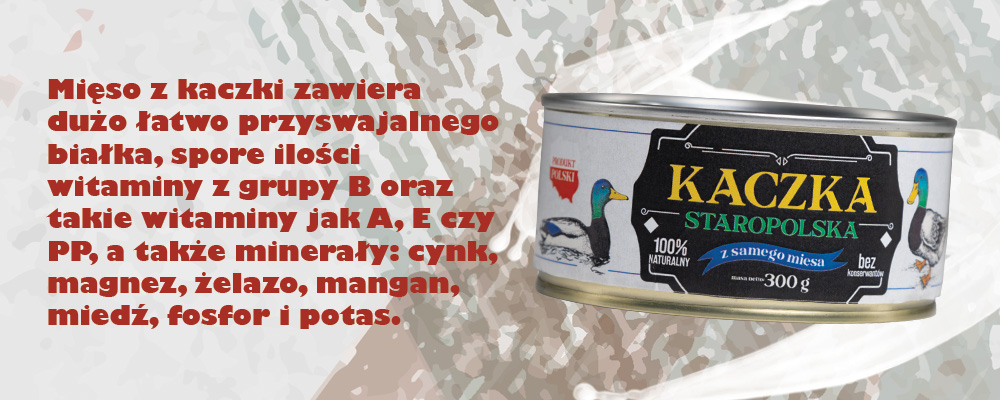 KACZKA STAROPOLSKAA 300g firmy Marlej wyprodukowana została bez sztucznych dodatków chemicznych, konserwantów, wypełniaczy i zagęszczaczy. Jest skład opracowany został przez Adolfa Kudlińskiego - jednego z bardziej znanych polskich preppersów. W każdej puszce znajdują się całe soczyste kawałki drobiowego mięsa, a smak, zapach oraz konsystencja sprawiają, że konserwy te często porównywane są do konserw wojskowych produkowanych w czasach PRL, uważanych do dzisiaj za