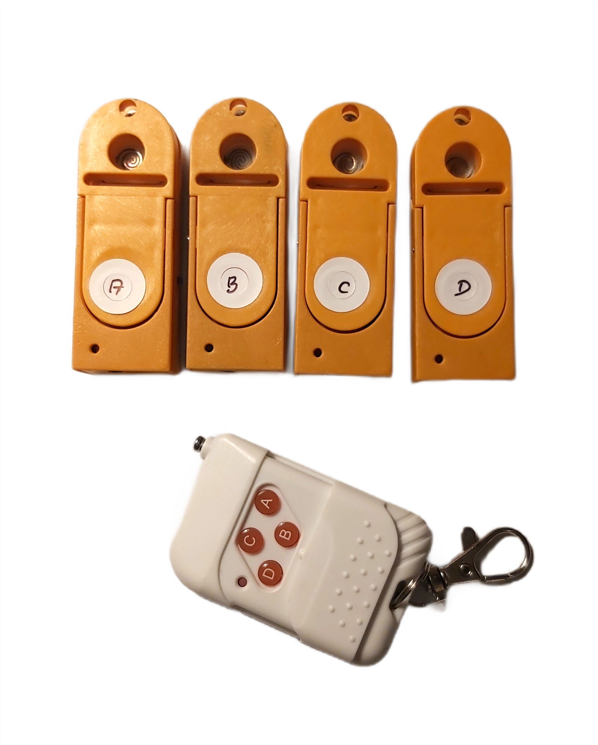 W zestawie znajduje się nadajnik 4 kanałowy, do którego zaprogramowane są 4 odbiorniki do odpalenia odpowiednimi przyciskami. Nadajnik można samodzielnie zaprogramować na ALL - jednoczesne odpalenie wszystkich zaprogramowanych odbiorników.