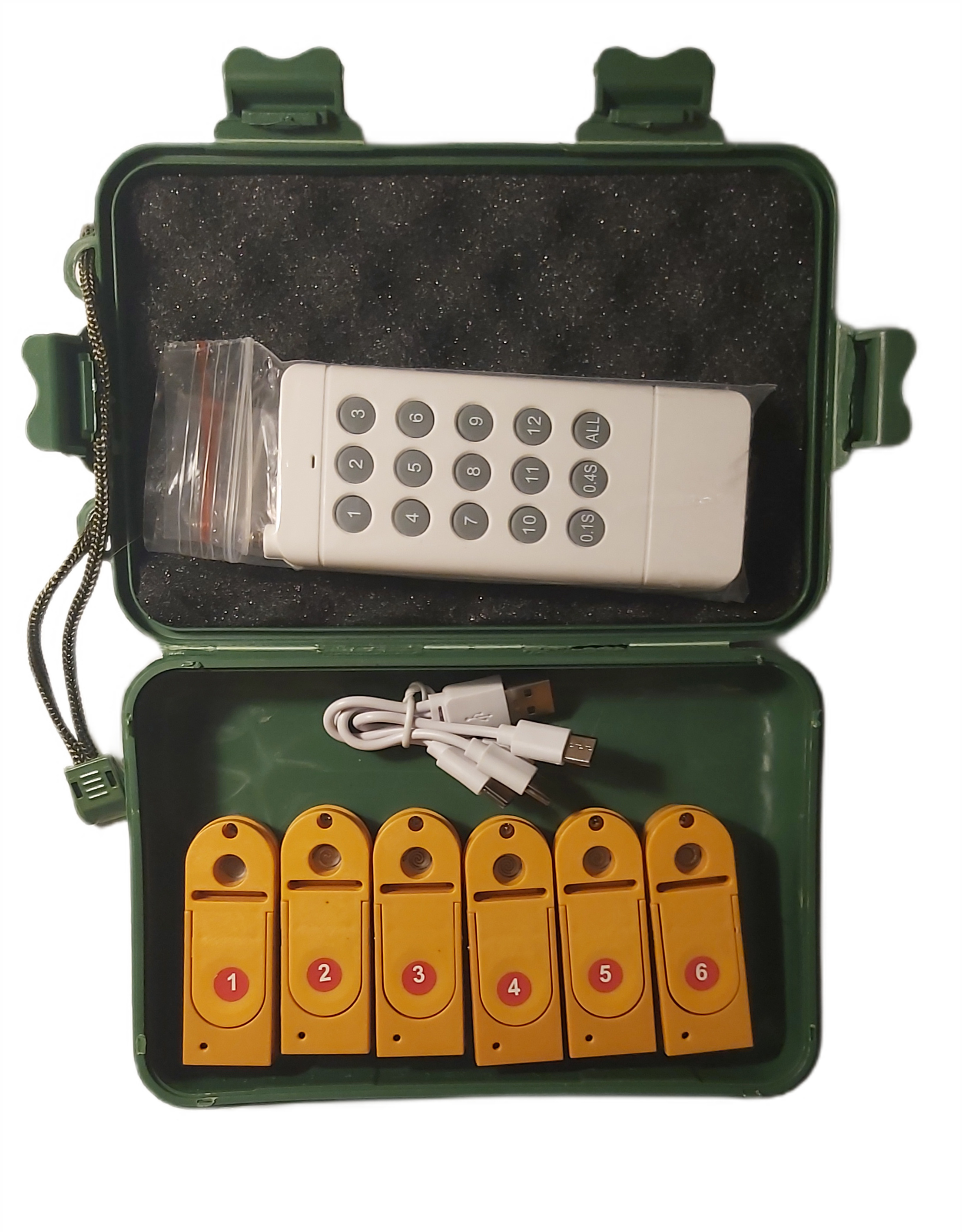 W zestawie znajduje się nadajnik 12 kanałowy, do którego zaprogramowanych jest 6 odbiorników do odpalenia odpowiednimi przyciskami. Do nadajnika można samodzielnie dodać dodatkowe odbiorniki oraz samodzielnie zaprogramować na ALL - jednoczesne odpalenie wszystkich zaprogramowanych odbiorników.