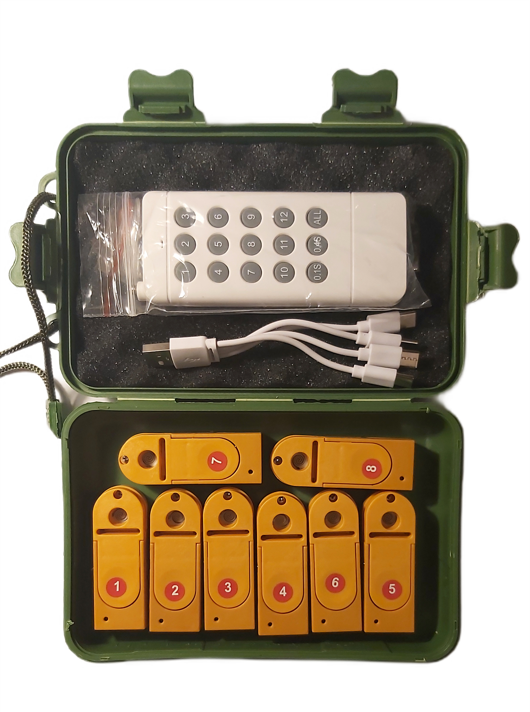 W zestawie znajduje się nadajnik 12 kanałowy, do którego zaprogramowanych jest 6 odbiorników do odpalenia odpowiednimi przyciskami. Do nadajnika można samodzielnie dodać dodatkowe odbiorniki oraz samodzielnie zaprogramować na ALL - jednoczesne odpalenie wszystkich zaprogramowanych odbiorników.